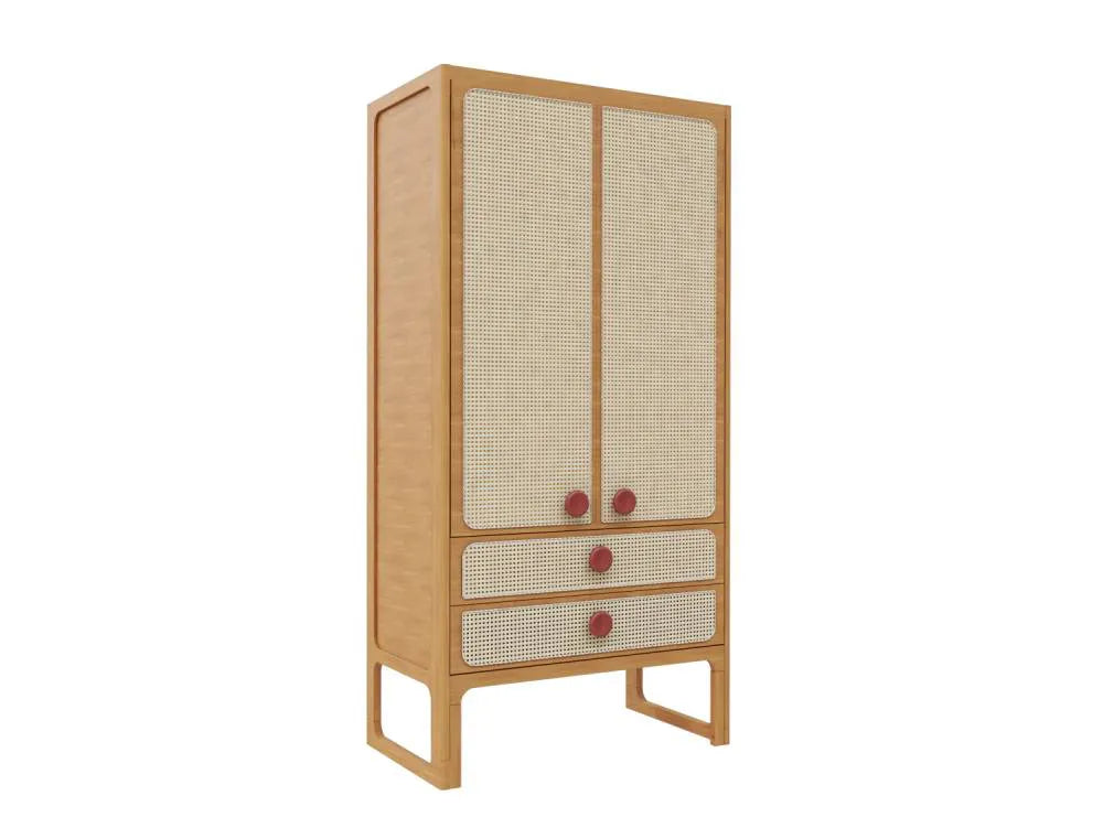 Suas portas e gavetas revestidas com palha sintética texturizada criam um belo jogo de luz e sombra, enquanto os puxadores redondos em madeira — disponíveis nas cores da paleta Cia do Móvel — trazem um toque lúdico, remetendo a elementos infantis com delicadeza.