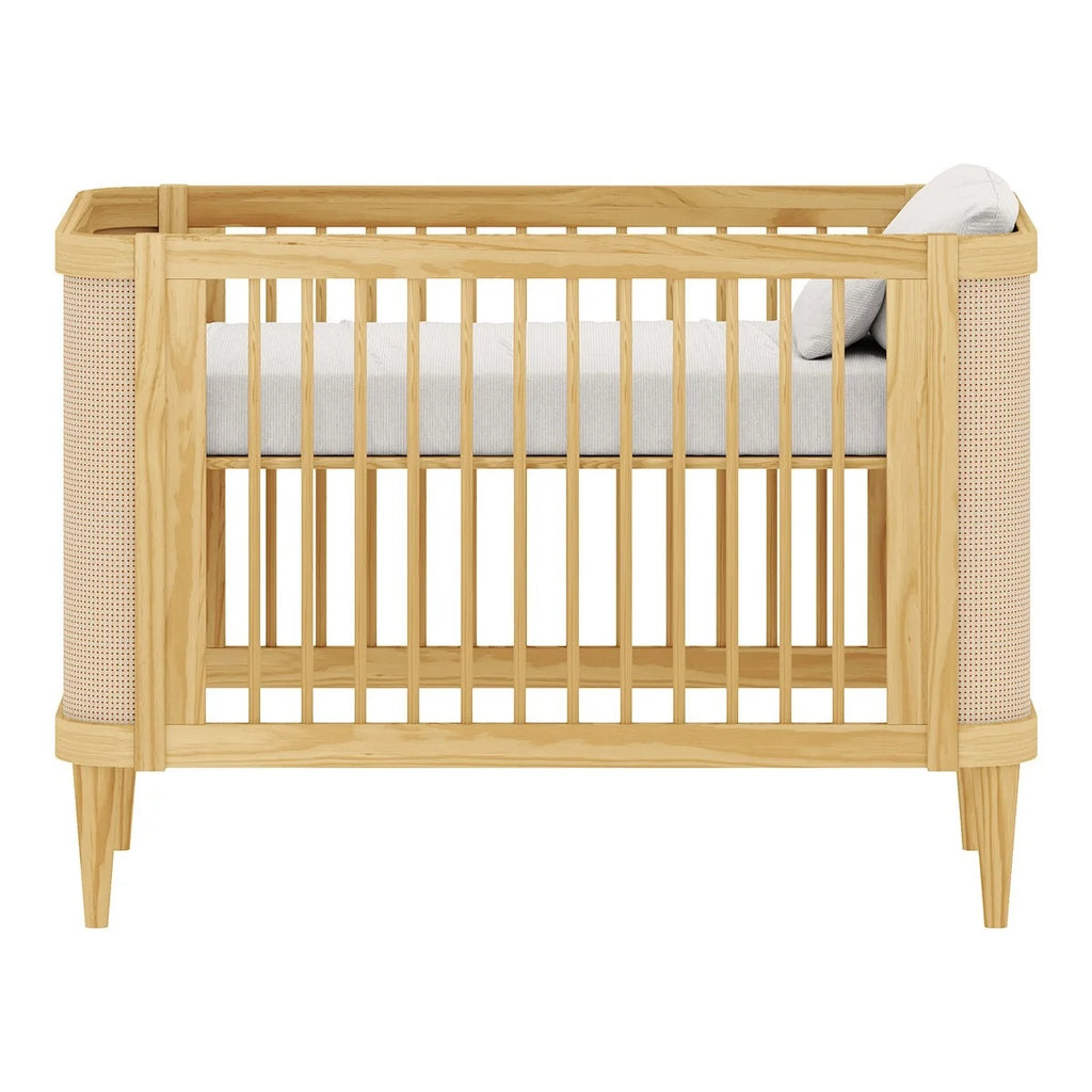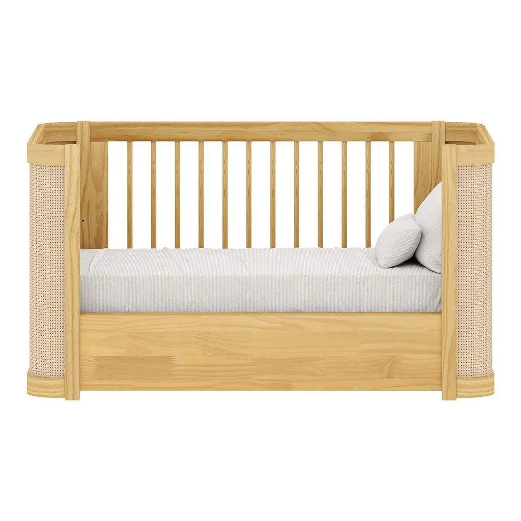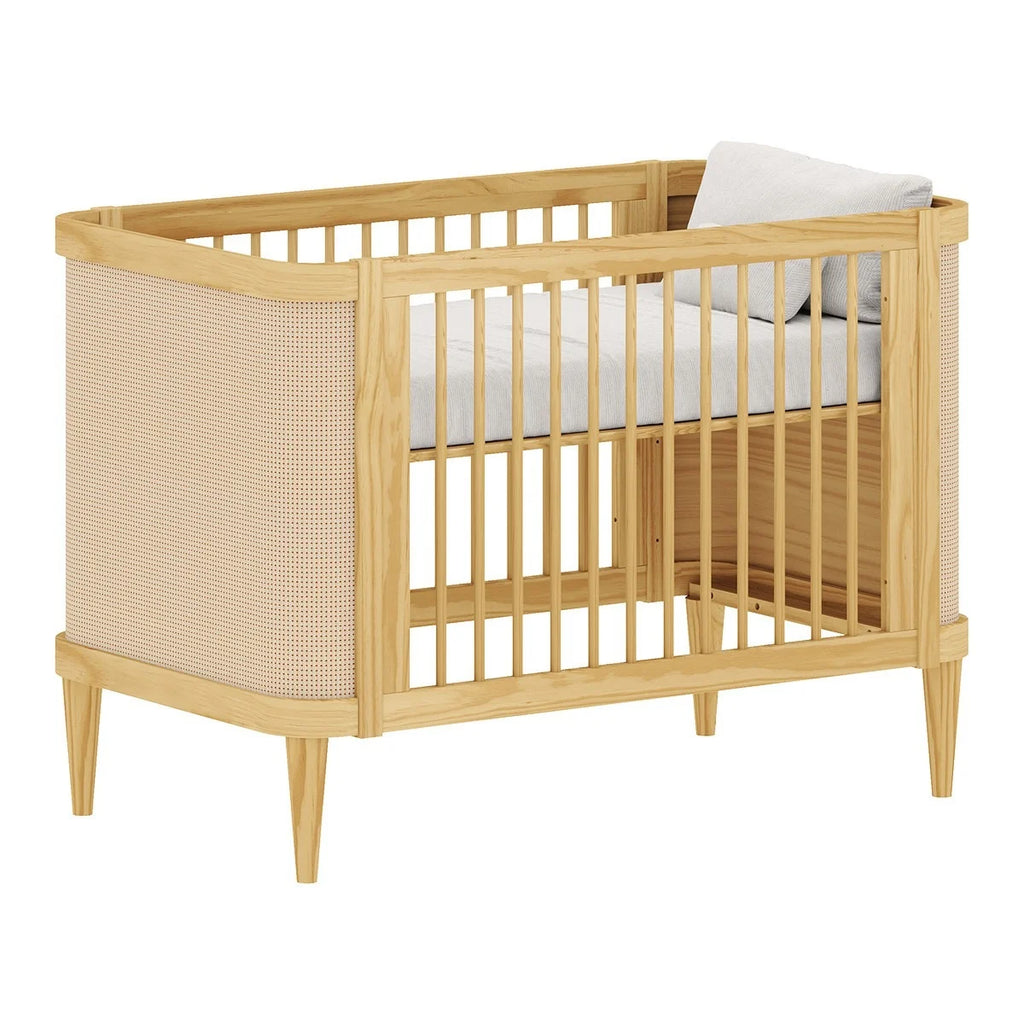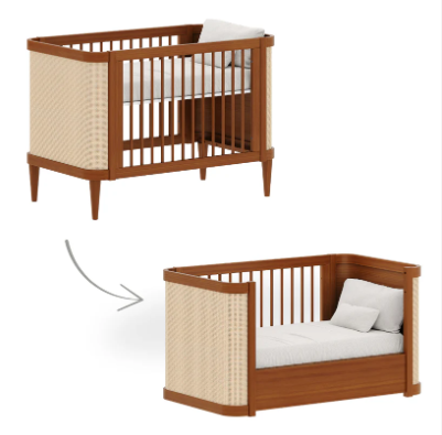 O berço Paglia em madeira, com detalhes nas cabeceiras em tela de Rattan, possui a opção 2 em 1, em que o móvel se transforma em Berço e Mini cama, acompanhando a criança do nascimento até a primeira infância.