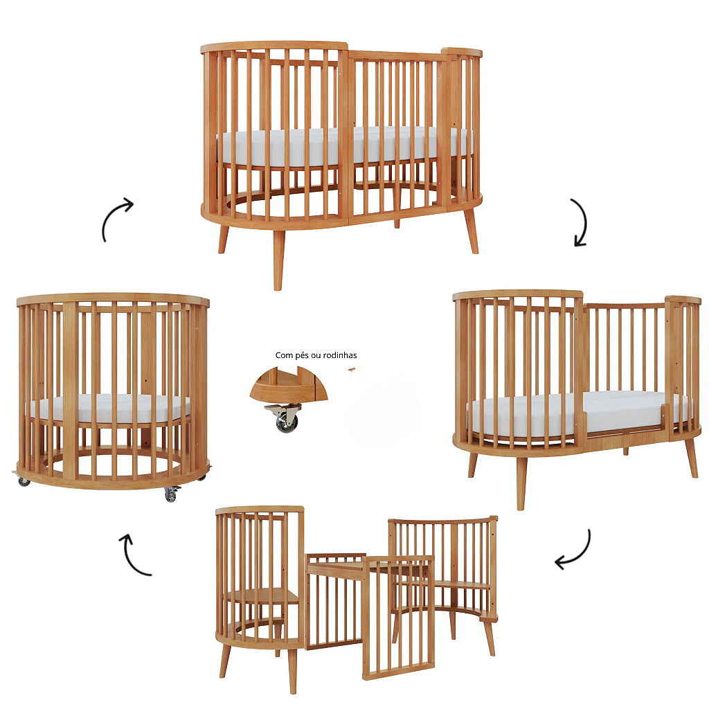 - O berço tem a possibilidade de se transformar em mini berço, mini cama e mesinha (kit para transformação incluso);