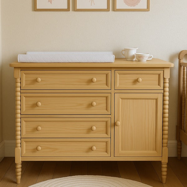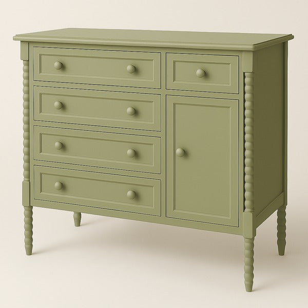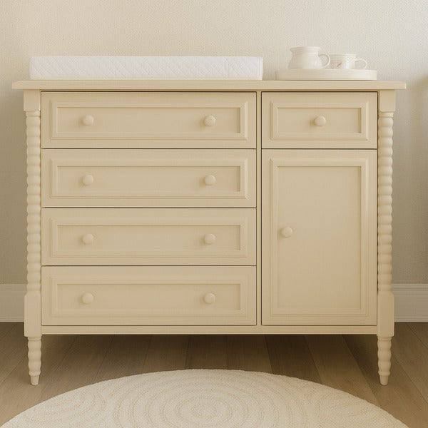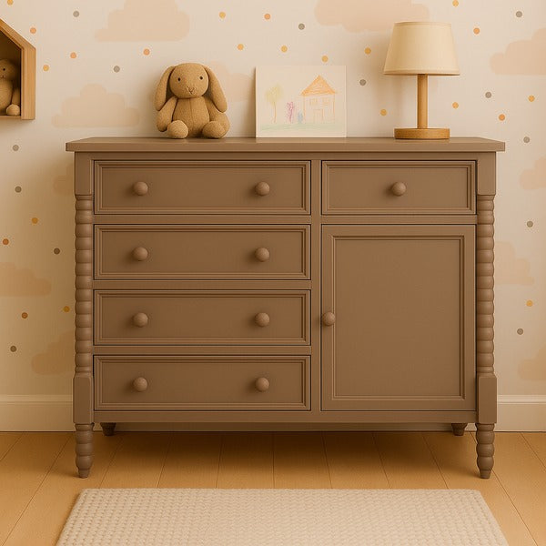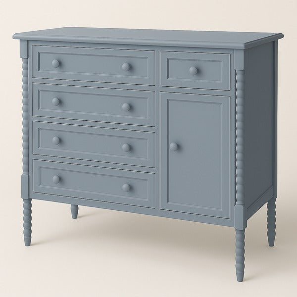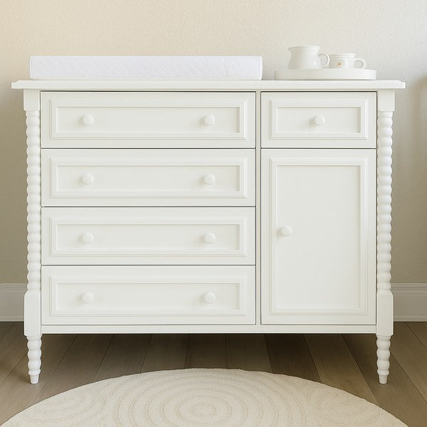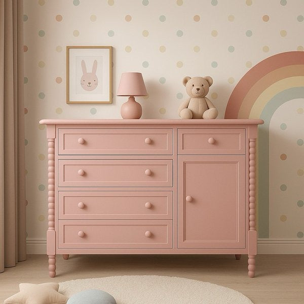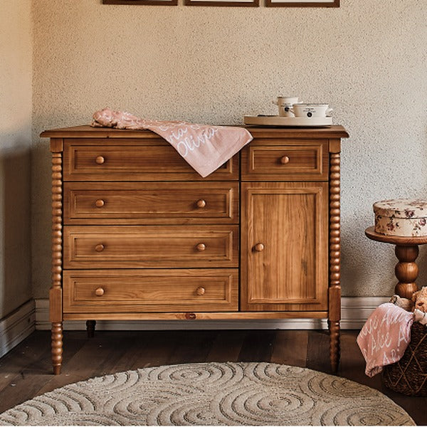Composta por 4 gavetas espaçosas com corrediças telescópicas metálicas e 1 porta com dobradiças resistentes, a cômoda oferece amplo espaço para organizar roupas, acessórios e objetos do dia a dia. O detalhe do puxador bolinha acrescenta delicadeza ao design, enquanto os pés com acabamento em laca e verniz elevam a sofisticação da peça.