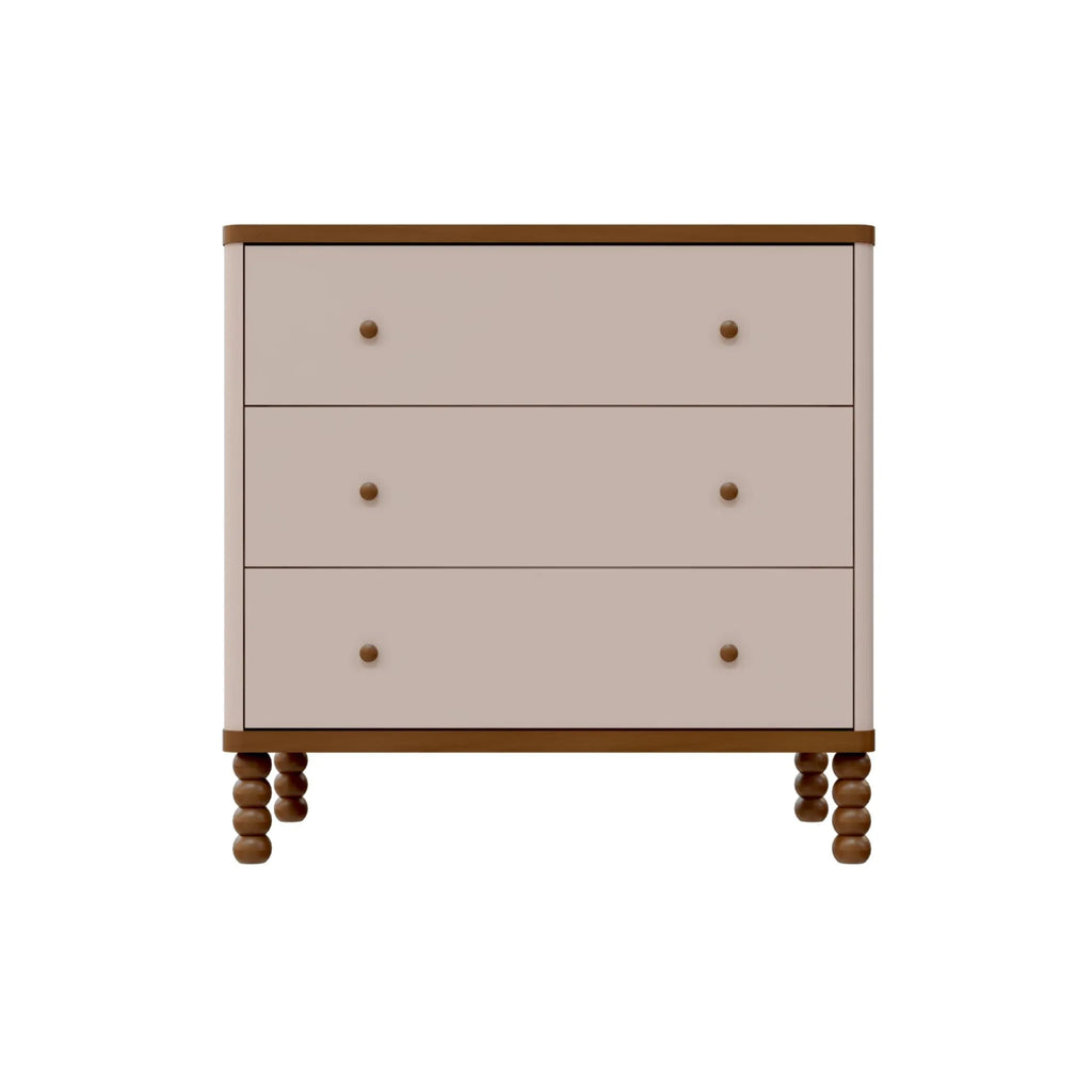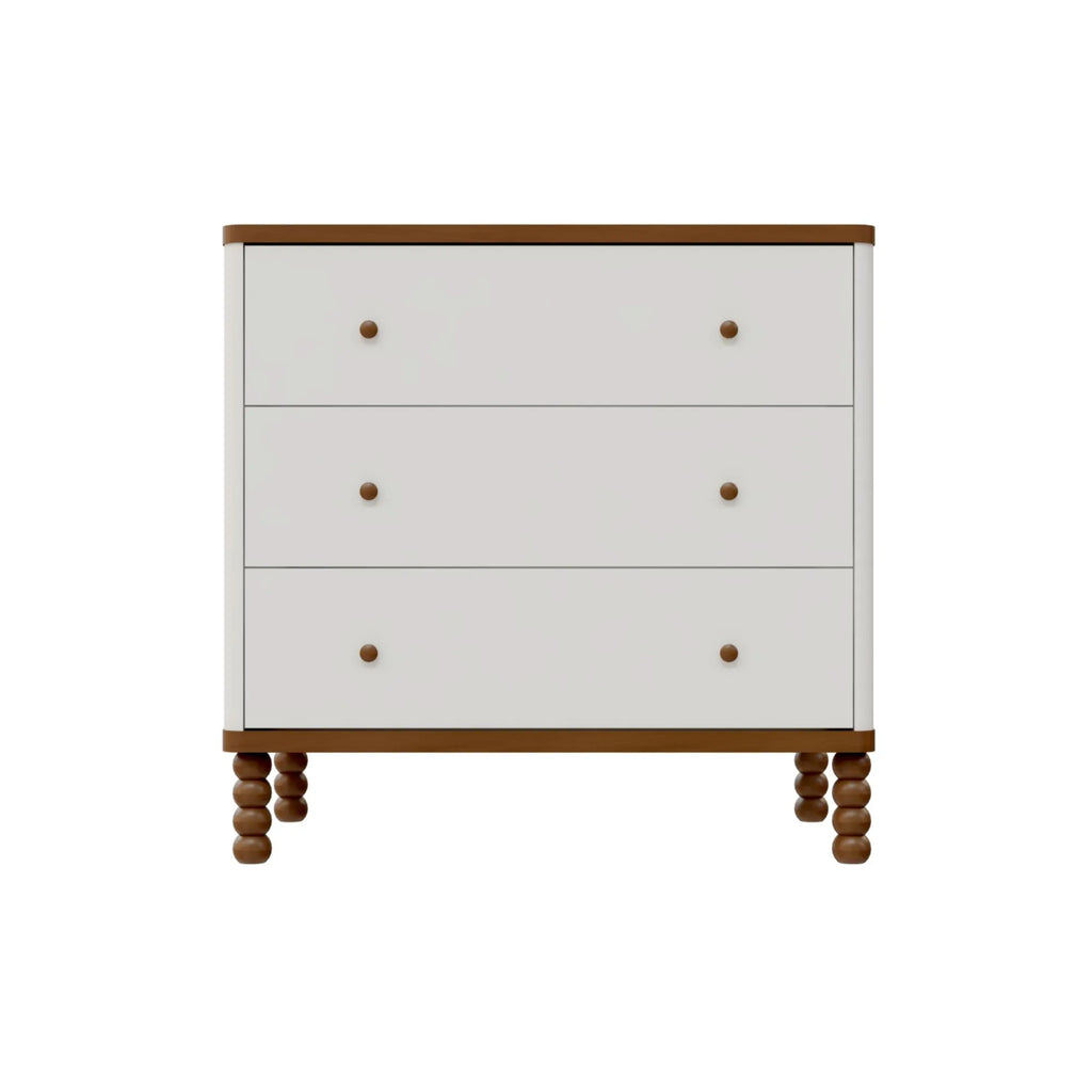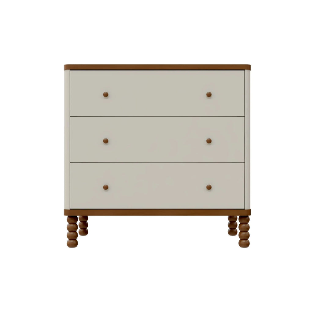 Conta com três amplas gavetas, proporcionando ótimo espaço para guardar roupas e acessórios. Os puxadores arredondados e os pés torneados em estilo bolinha conferem um toque retrô, unindo funcionalidade e beleza em uma única peça.