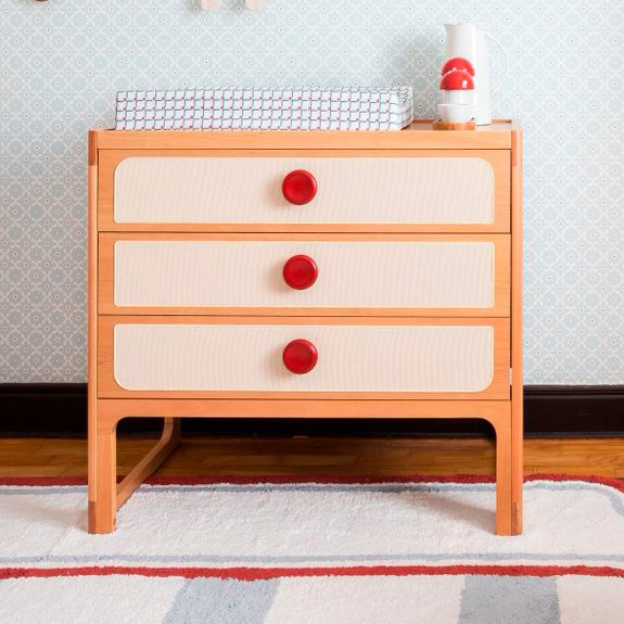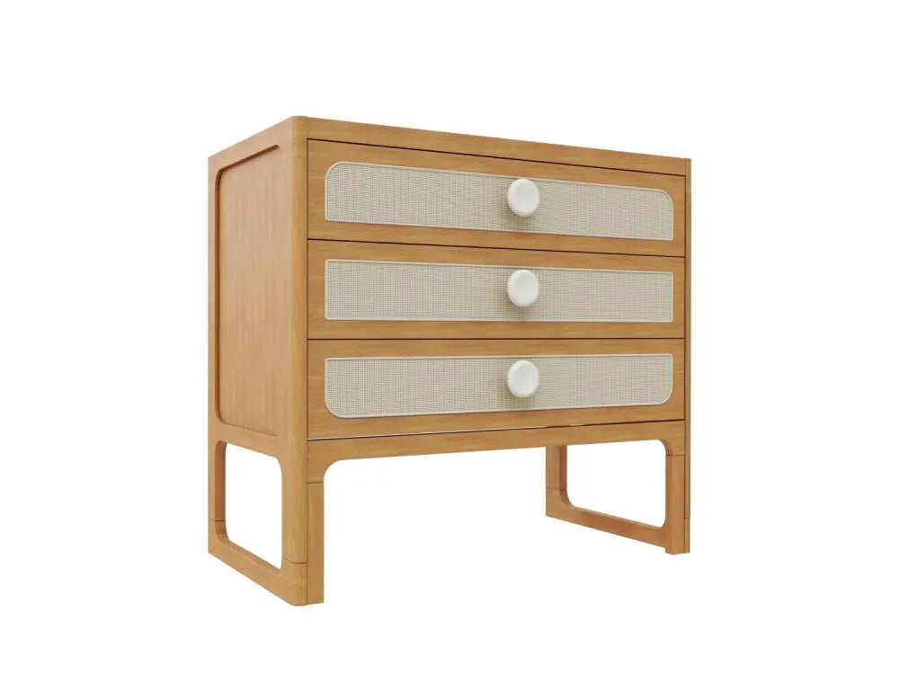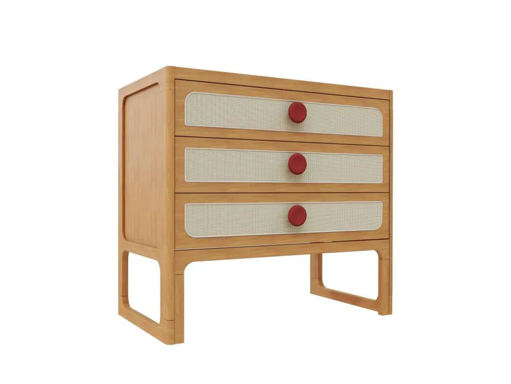 Seu diferencial está nas frentes das gavetas com acabamento em palha sintética, que conferem textura e profundidade visual ao móvel. Os puxadores redondos em madeira — disponíveis nas cores da paleta Cia do Móvel — trazem um toque lúdico e divertido, remetendo a botões de brinquedo, e fazem da cômoda um destaque encantador no ambiente.