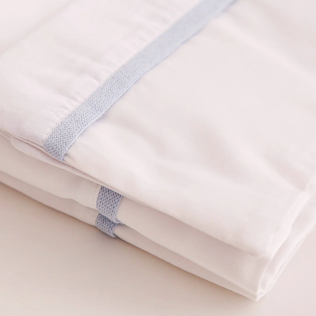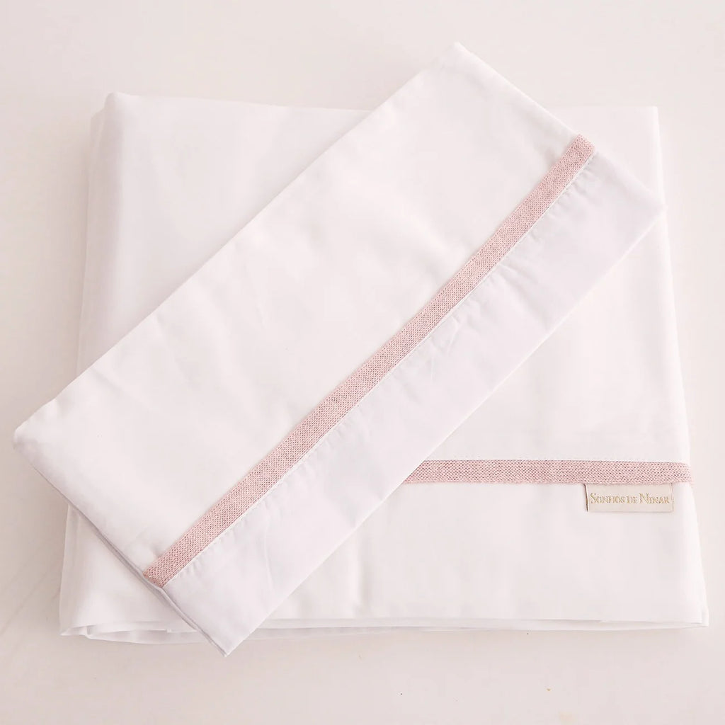 O jogo de lençol para berço clássico Sonhos de Ninar Confeccionada em Percal 800 fios brancos, com fino acabamento em tricô em cores. Tecidos 100% em algodão. (Veja o mostruário das cores e tramas do tricô disponíveis na descrição completa do produto)