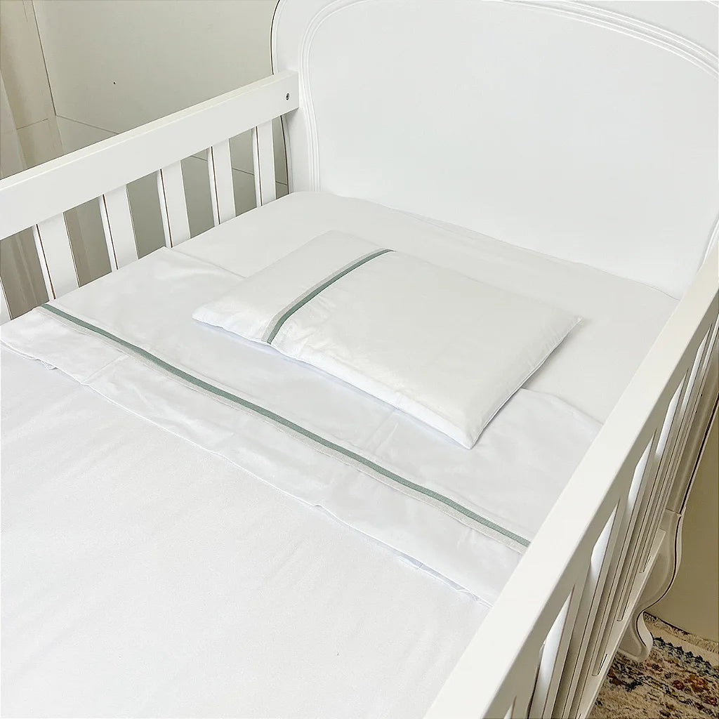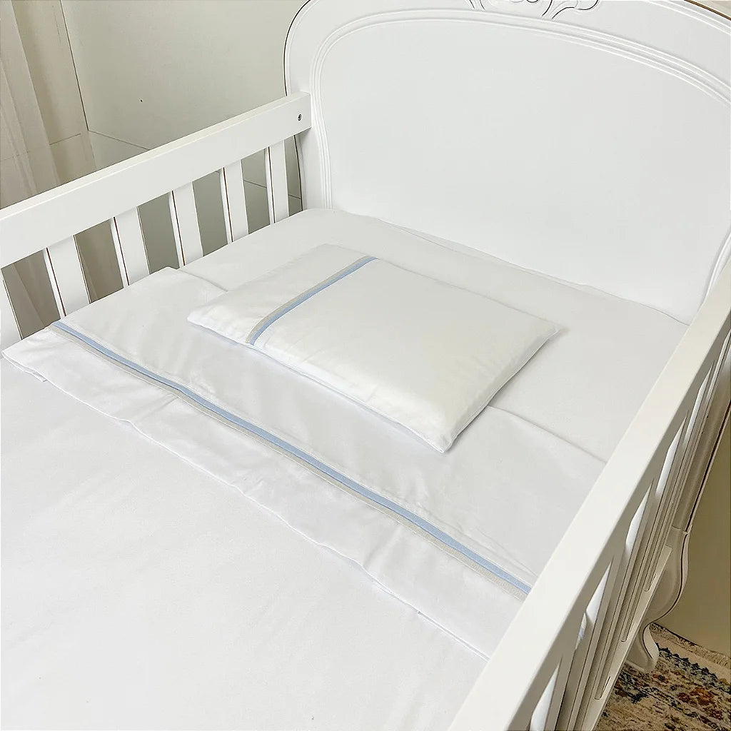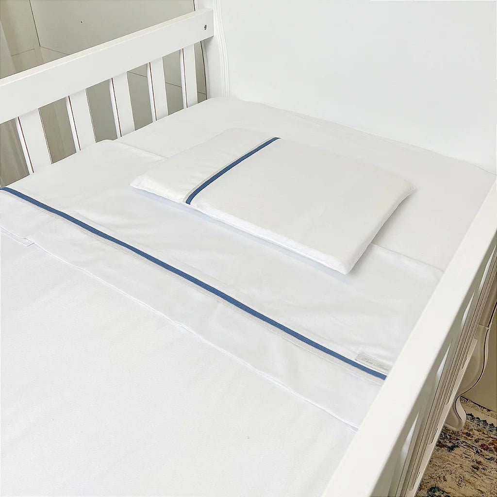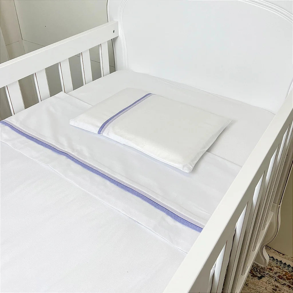 O jogo de lençol para berço da coleção Duo Sonhos de Ninar Confeccionada em Percal, com fino acabamento em tricot en cores. Tecido 100% em algodão. (Veja o mostruário das cores e tramas do tricot disponiveis na descrição completa do produto)