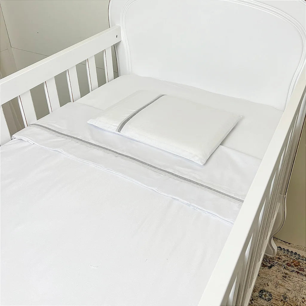 O jogo de lençol para berço da coleção Duo Sonhos de Ninar Confeccionada em Percal algodão em branco, com fino acabamento em tricot em cores. Tecido 100% em algodão, combina o encanto do acabamento ao toque suave e macio do tecido natural, o resultado é um berço de arrumação clássica que complementa a decoração proporcionando conforto e suavidade para os pequenos.