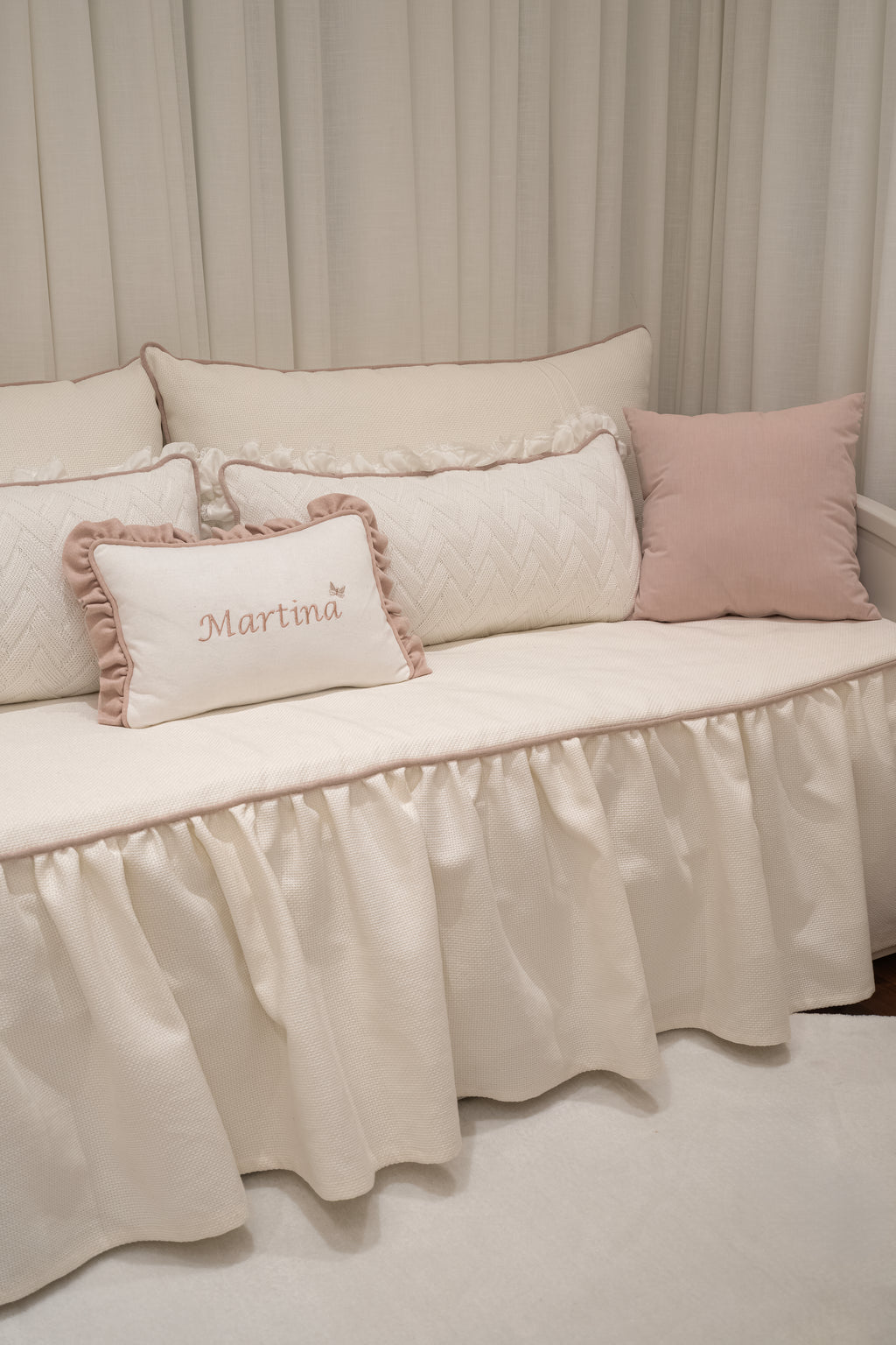O Kit Cama Solteiro Personalizado com Nome - 8 peças peças foi criado especialmente para compor o encantador Quarto da Martina, assinado por Naty e Bento, um ambiente inspirador no que une delicadeza, cor e imaginação.