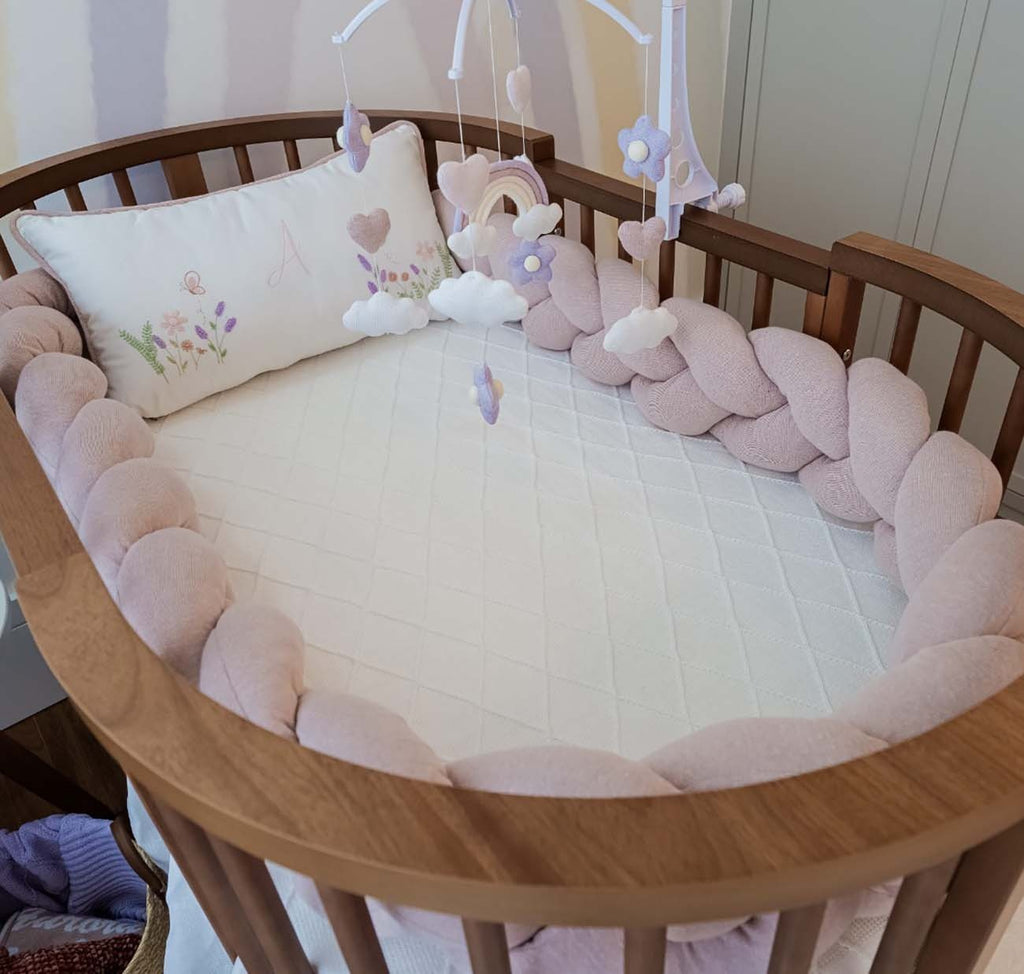 - 1 Trança de tricô em 3 lados, confeccionada em cores harmoniosas, que protege a bebê das grades do berço e permite maior circulação de ar, além de visibilidade para os pais.