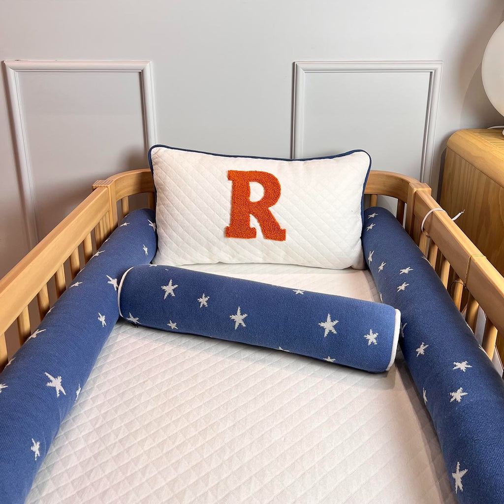 Crie um espaço de conforto e segurança no berço do seu bebê com o Kit Protetor de Berço 5 Peças da Coleção Astronauta. Feito em tecido Pettenati de alta qualidade, esse kit traz proteção e beleza, combinando a suavidade do material com o charme dos rolos em tricô com estampa de estrelas. A almofada de cabeceira personalizada com a inicial do seu bebê dá um toque exclusivo e encantador, perfeito para compor um ambiente lúdico e acolhedor.