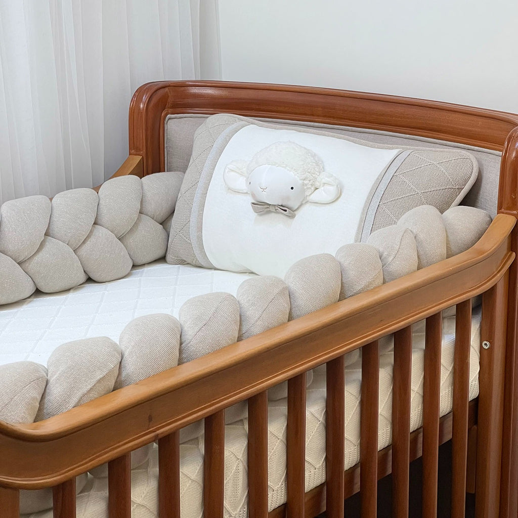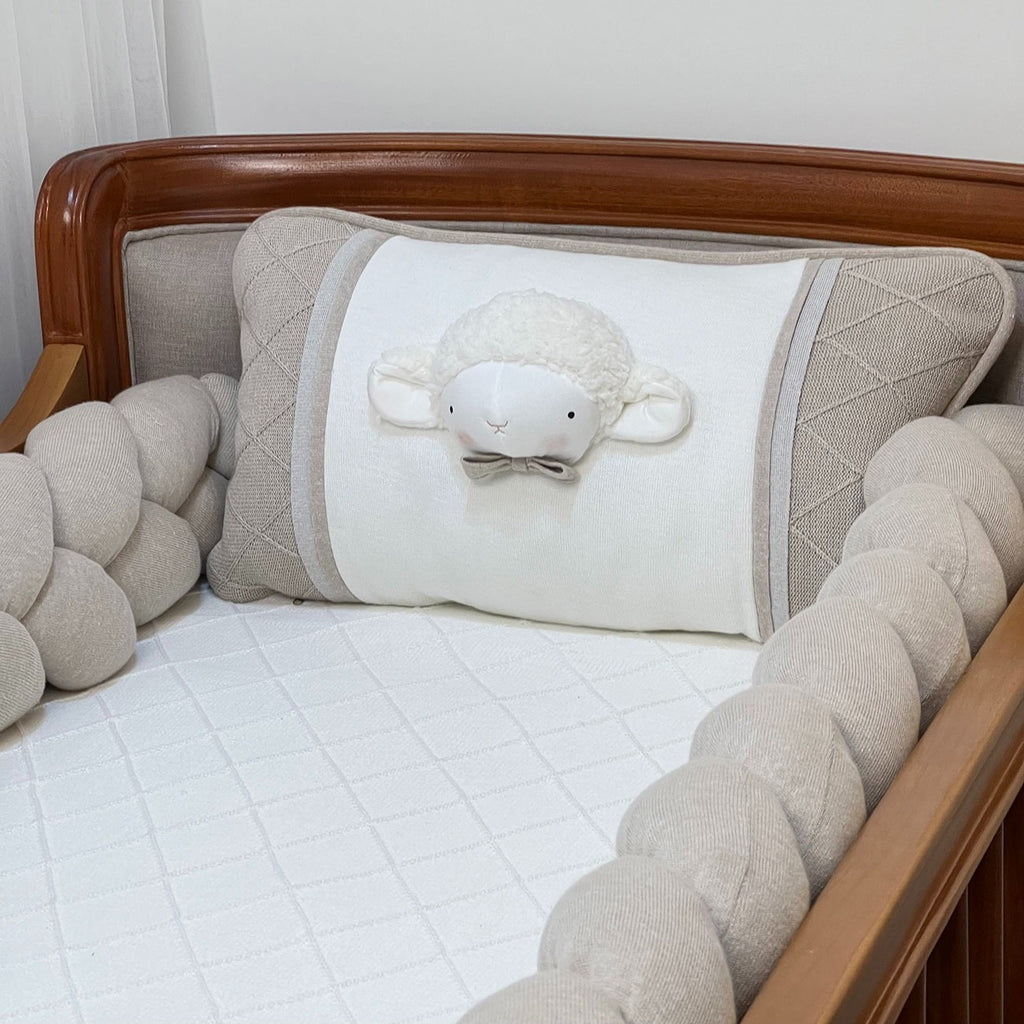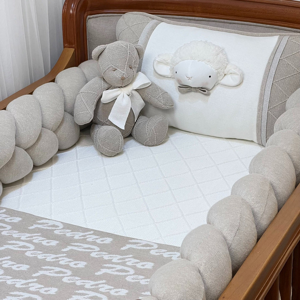 O Kit Berço Ovelha Trança Bege é confeccionado no tricô, possui aplicações na cabeceira dando um toque de fofura, o charme fica por conta do mix de tramas do nosso tricô.