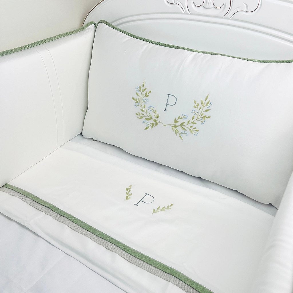 Crie um ambiente seguro e cheio de estilo para o seu bebê com o Kit Protetor de Berço Pietro da Sonhos de Ninar. Feito em percal de 800 fios, com a opção de 400 fios, esse kit proporciona um toque de suavidade e qualidade incomparáveis, além de uma durabilidade que acompanha cada momento especial. Com laterais altas e um charmoso bordado de folhas junto à inicial do bebê, o kit é perfeito para quem busca um toque exclusivo e acolhedor no berço do pequeno.