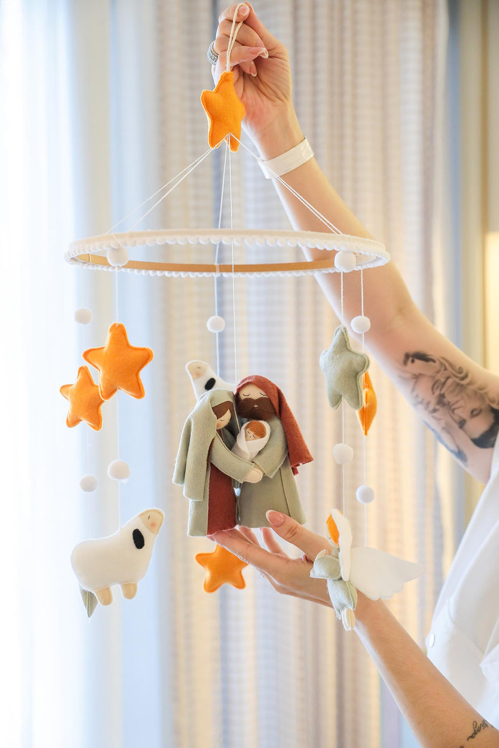 O Mobile Personalizado José apresenta um pastor central e pequenas ovelhas delicadas, todos feitos com materiais antialérgicos e acabamentos de alta qualidade. Essa composição transforma o ambiente em um refúgio de serenidade e amor, enquanto desperta a curiosidade e imaginação do bebê com o movimento suave dos elementos.