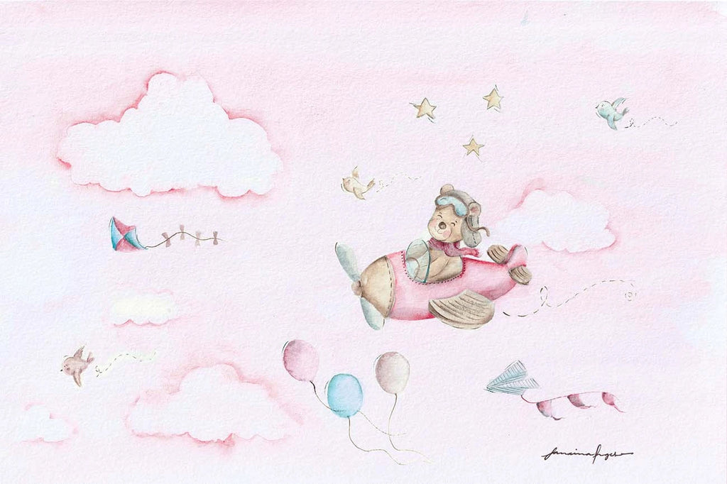 Transforme o quarto do seu bebê em um conto de fadas com nosso exclusivo Papel de Parede Infantil Aviador, com desenho de aquarela em tons de azul-claro e rosa.