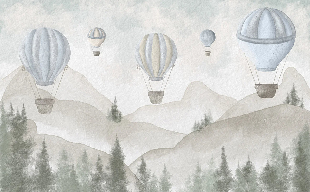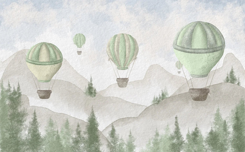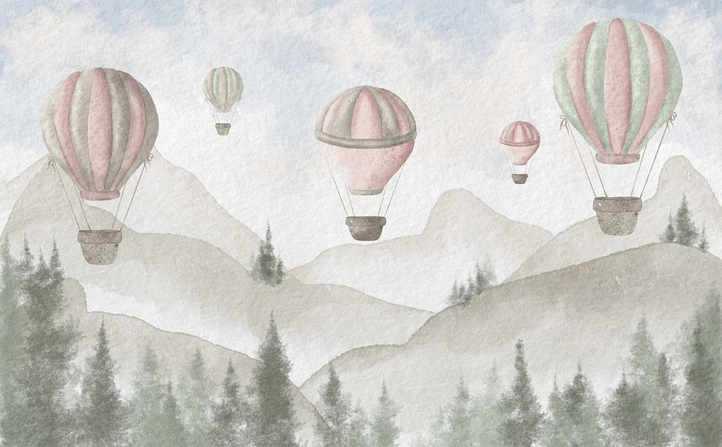 Transforme o quarto do seu bebê em um conto de fadas com nosso exclusivo Papel de Parede Infantil Balões na Floresta, com desenho de aquarela em tons de azul-claro, verde-claro e rosé.