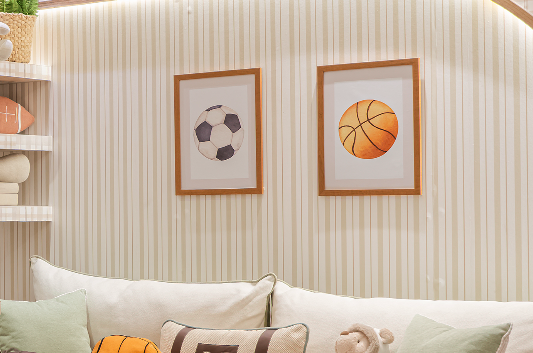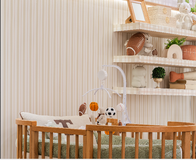 Papel de Parede infantil Listras verde e bege, papel de base nonwoven resistente a arranhões, atóxico e à base d'água com acabamento fosco.