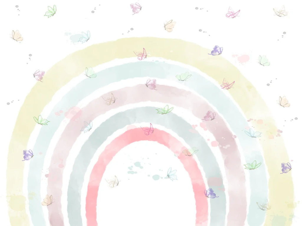 Transforme o quarto do seu bebê em um conto de fadas com nosso exclusivo Papel de Parede Infantil de Arco-íris e Borboletas, com desenho de aquarela.