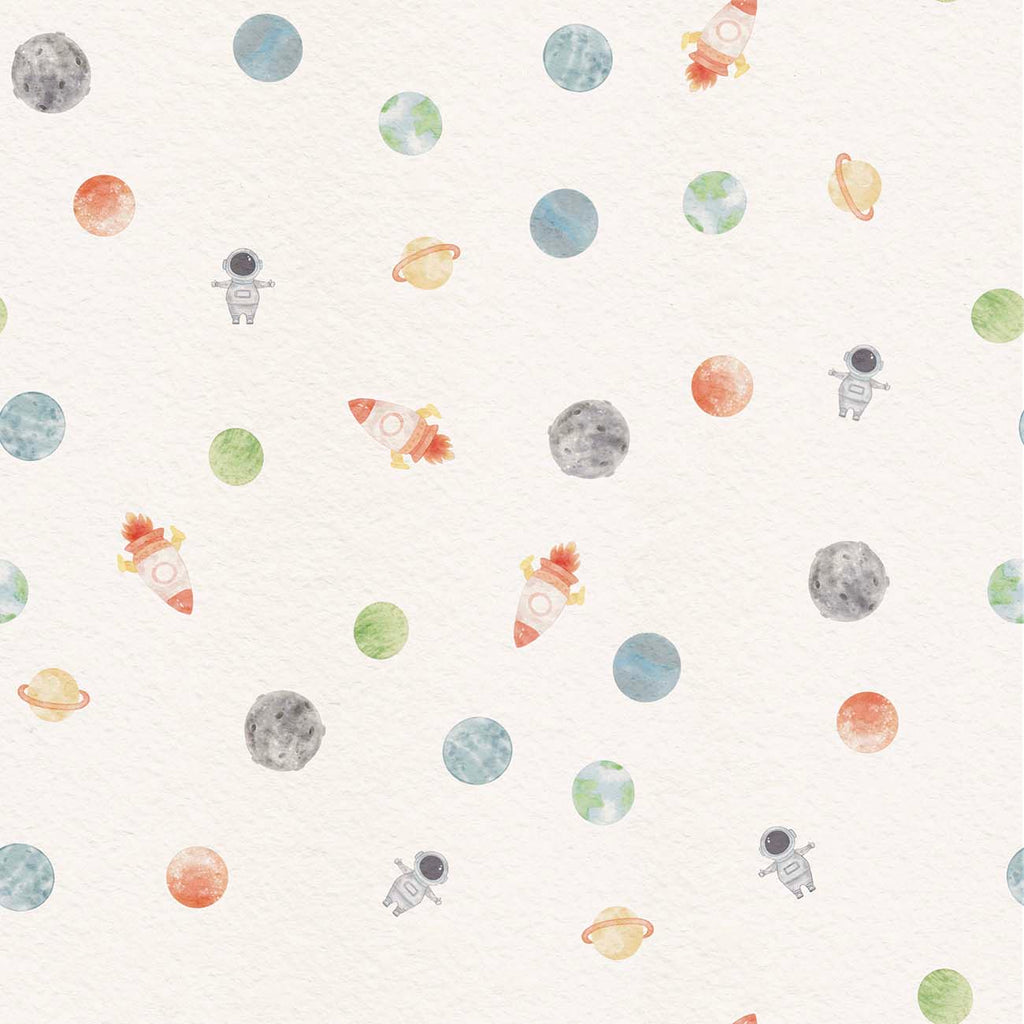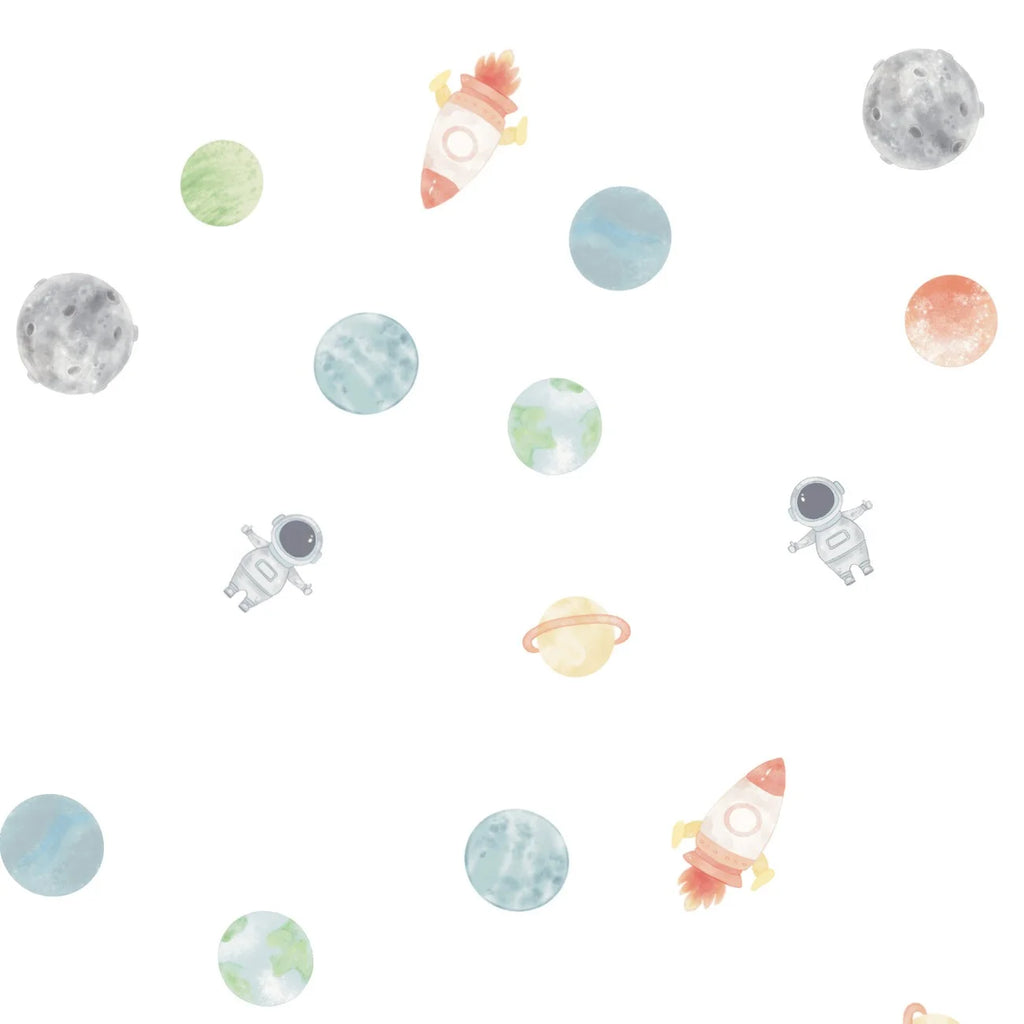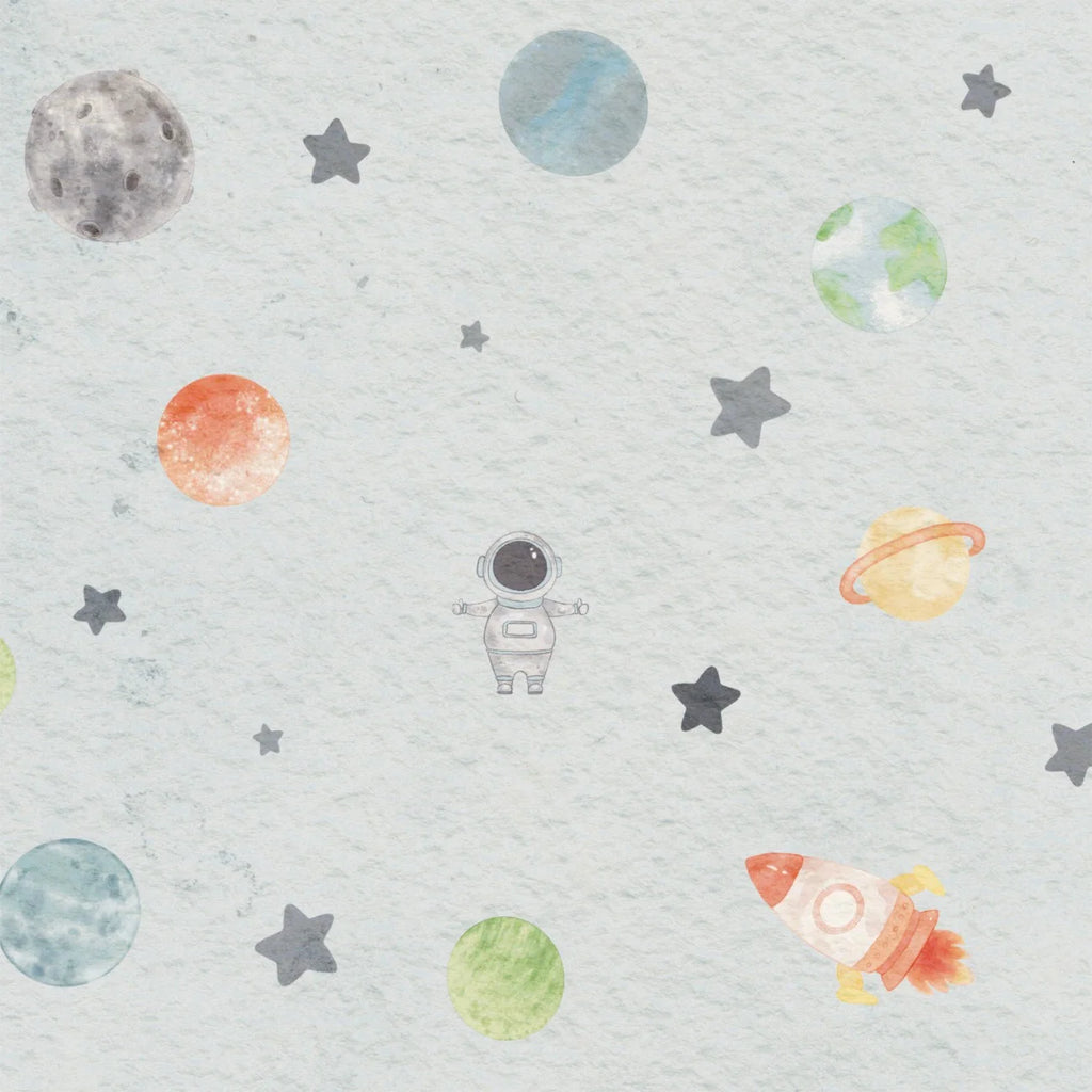 Transforme o quarto do seu bebê em um conto de fadas com nosso exclusivo Papel de Parede Infantil Estampa de Astronauta com Planetas, com desenho de aquarela.