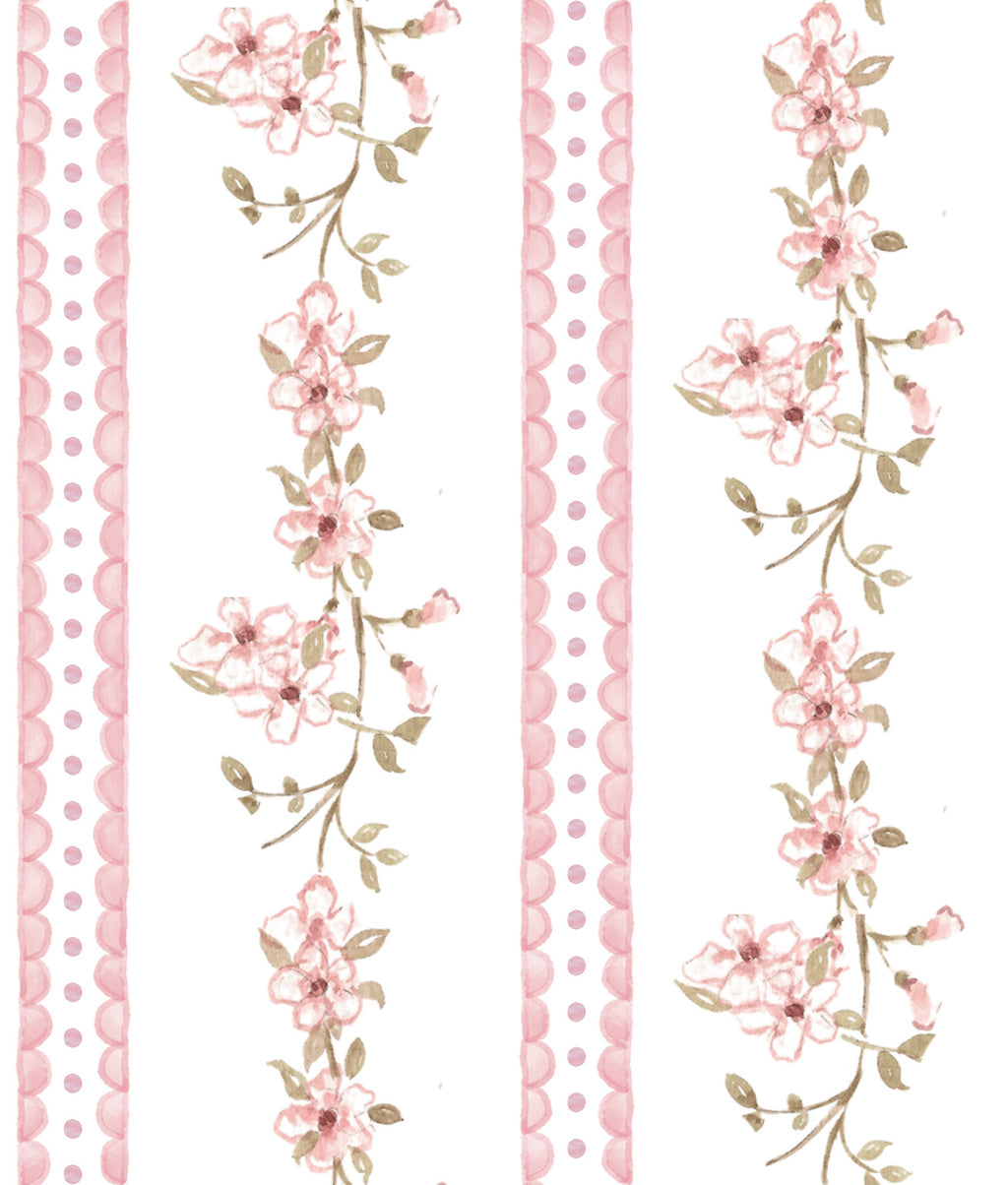 Transforme o quarto do seu bebê em um conto de fadas com nosso exclusivo Papel de Parede Infantil Listrado, com desenho de aquarela com listras florais em tons de rosê.