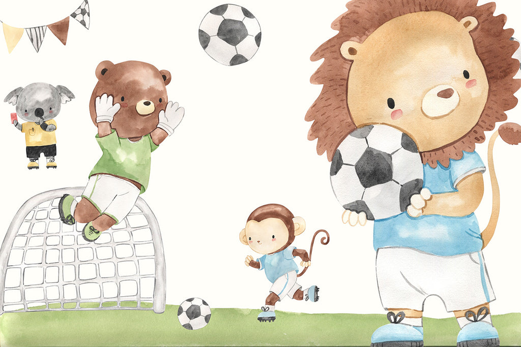 Transforme o quarto do seu bebê em um conto de fadas com nosso exclusivo Papel de Parede Infantil Futebol Animais, com desenho de aquarela.