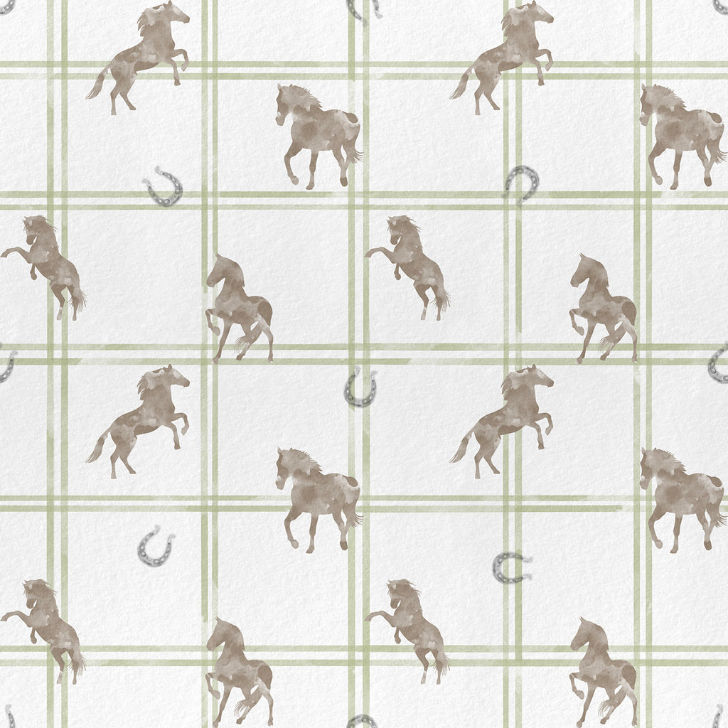 Transforme o quarto do seu bebê em um conto de fadas com nosso exclusivo Papel de Parede Infantil Xadrez Cavalos, com desenho de aquarela.