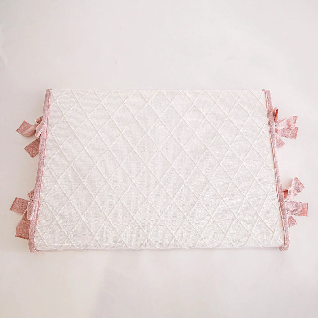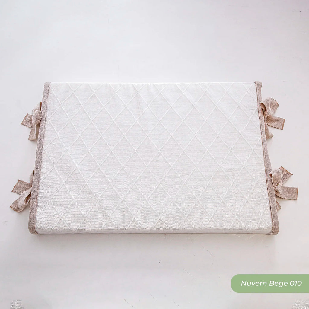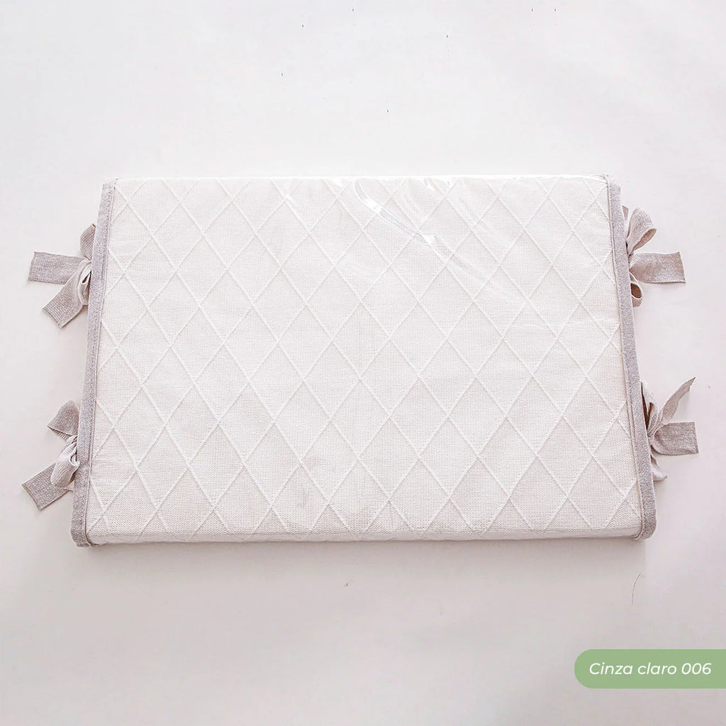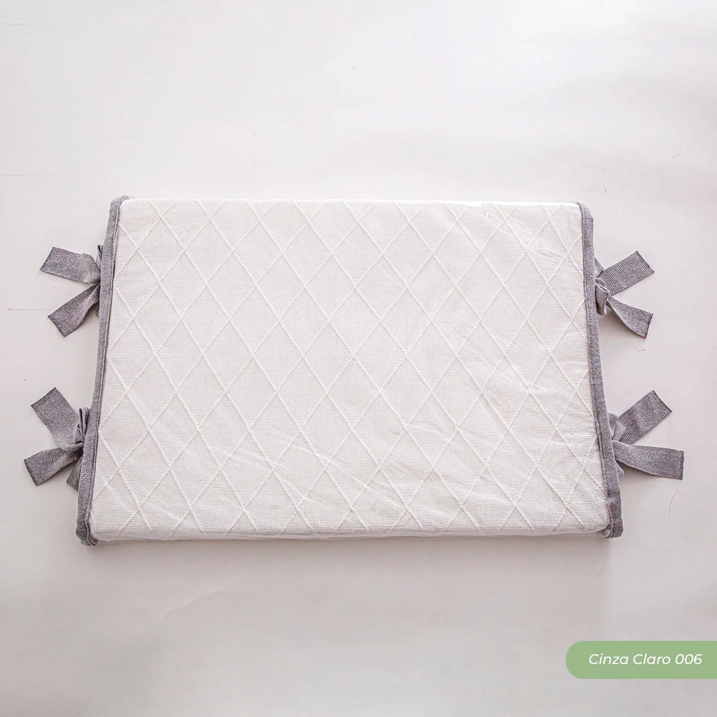 Trocador de Bebê tradicional reto elaborado em tecido Tricô na trama Losango, com enchimento macio. Possui capa plástica transparente com bordinhas e laço de tricô disponível em variadas cores. A capa é removível para que você possa lavar e higienizar. O trocador pode ser colocado em qualquer superfície do quartinho para que as trocas de fraldas sejam ainda mais práticas.